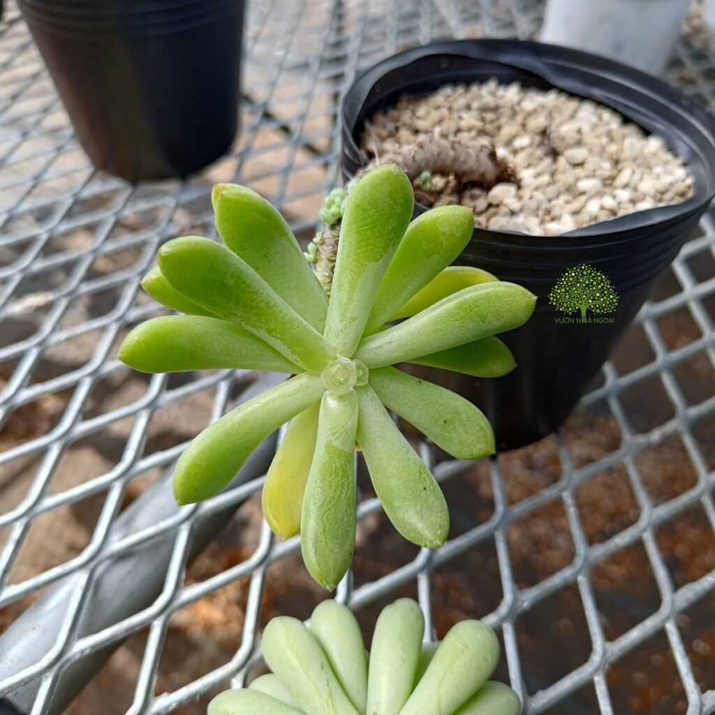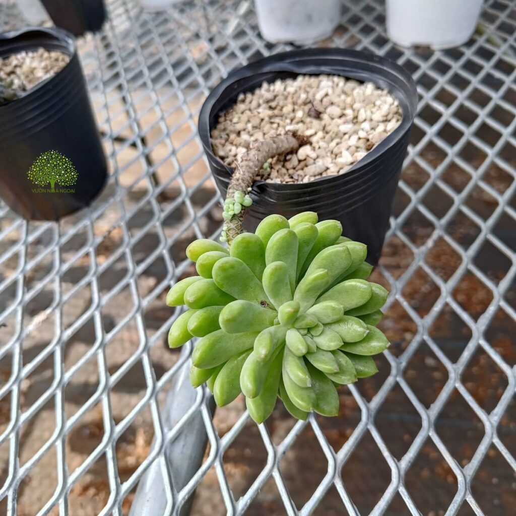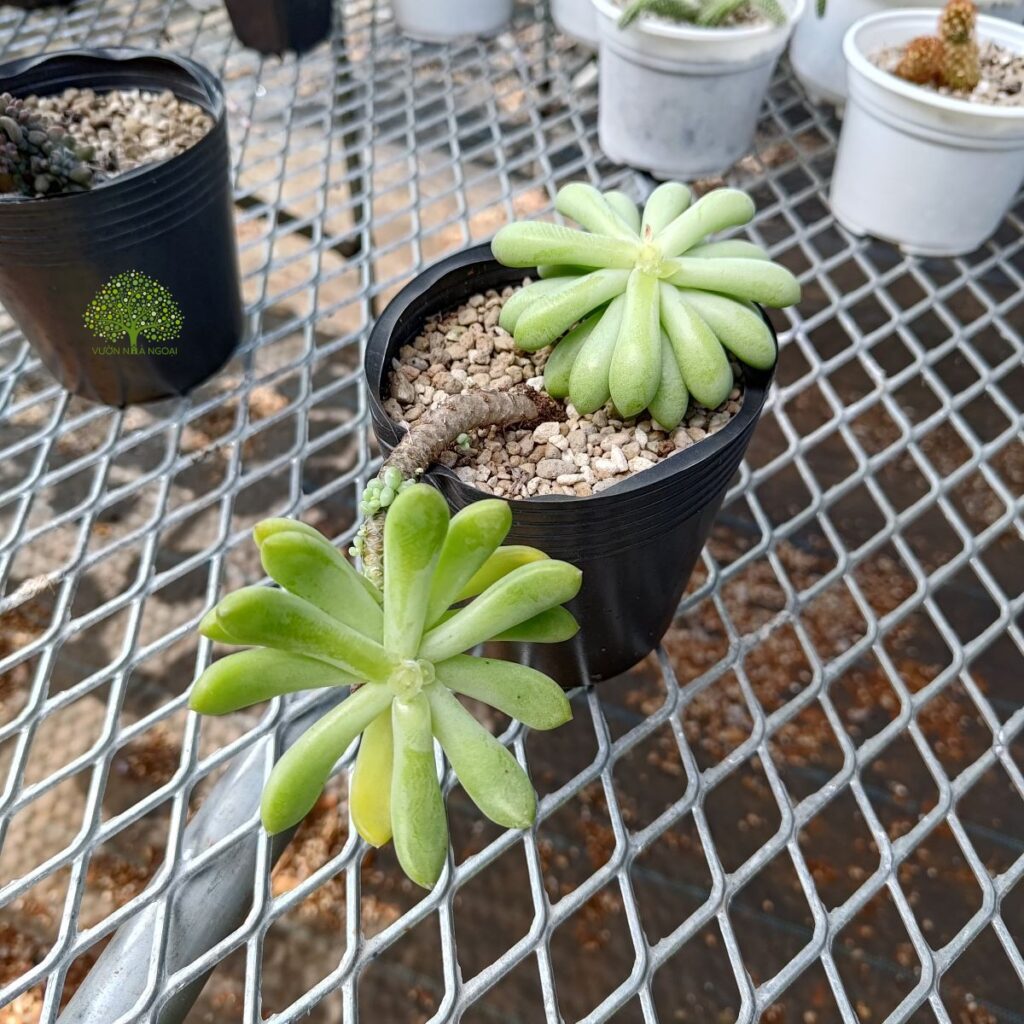 Cây sen đá thược dược với thân vươn dài và cong queo do già cỗi và mang chùm lá nặng trên đầu.