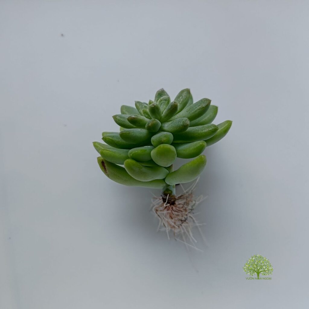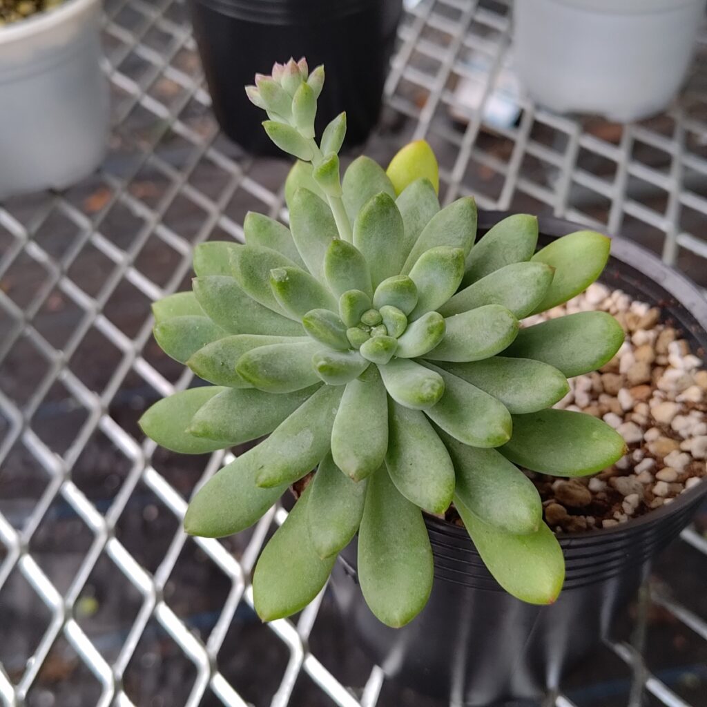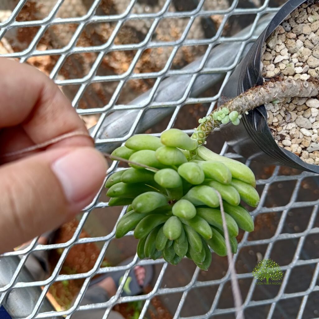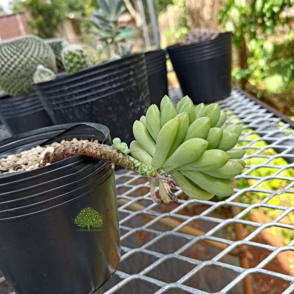 Cây sen đá thược dược với thân vươn dài và cong queo do già cỗi và mang chùm lá nặng trên đầu.